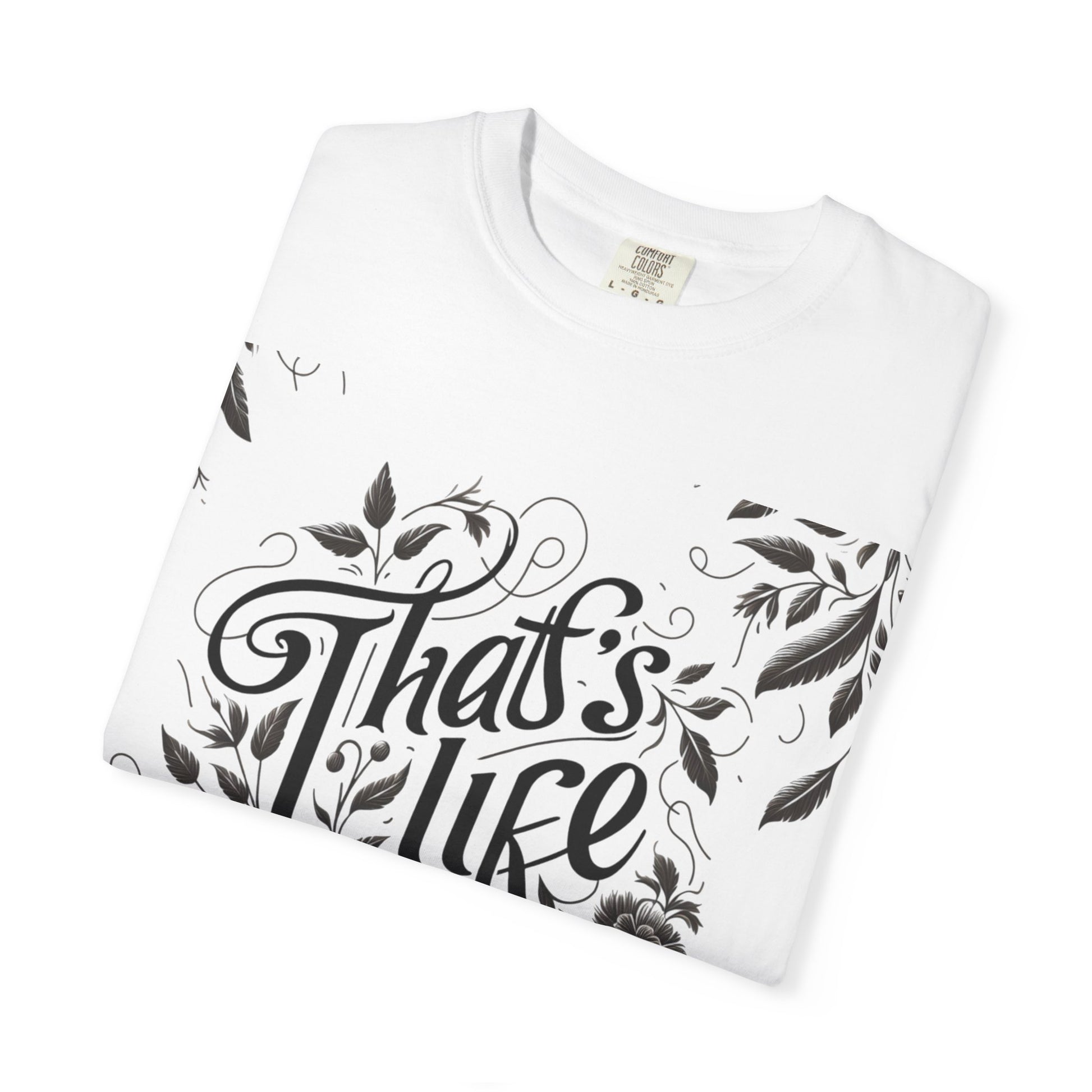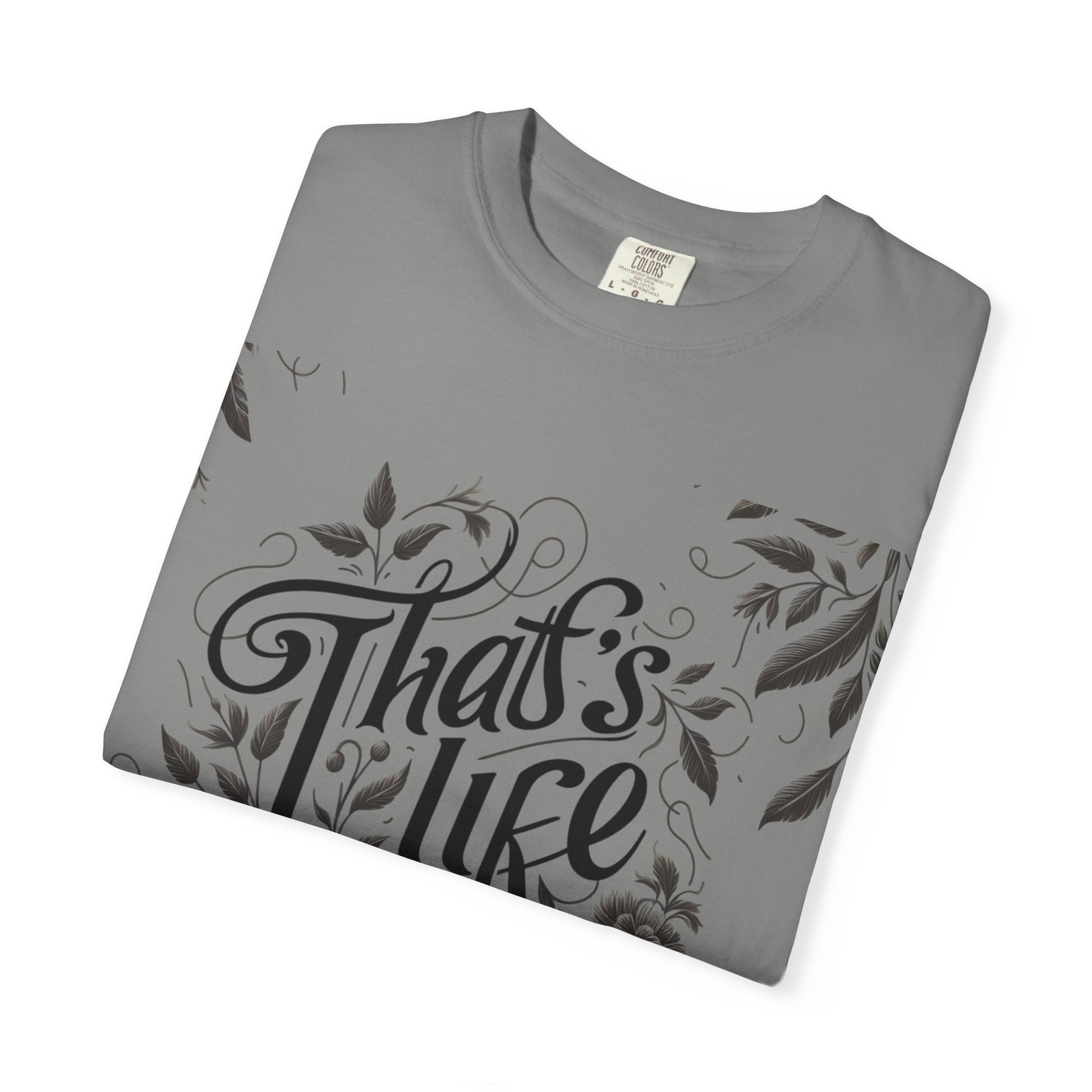 This garment-dyed T-shirt is a timeless addition to any wardrobe, featuring a simple 'Thats life' design. The relaxed fit and classic crew neckline make it perfect for daily wear, whether you're lounging at home or heading out. Ideal for adults looking for a comfortable and stylish shirt to express themselves.